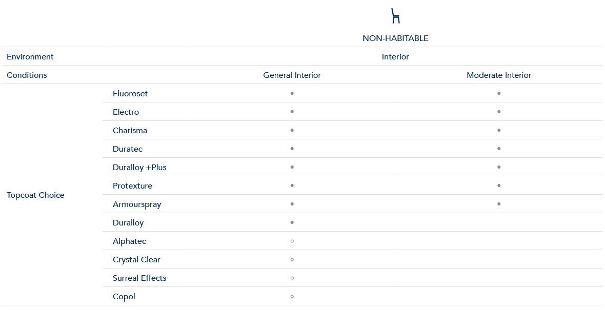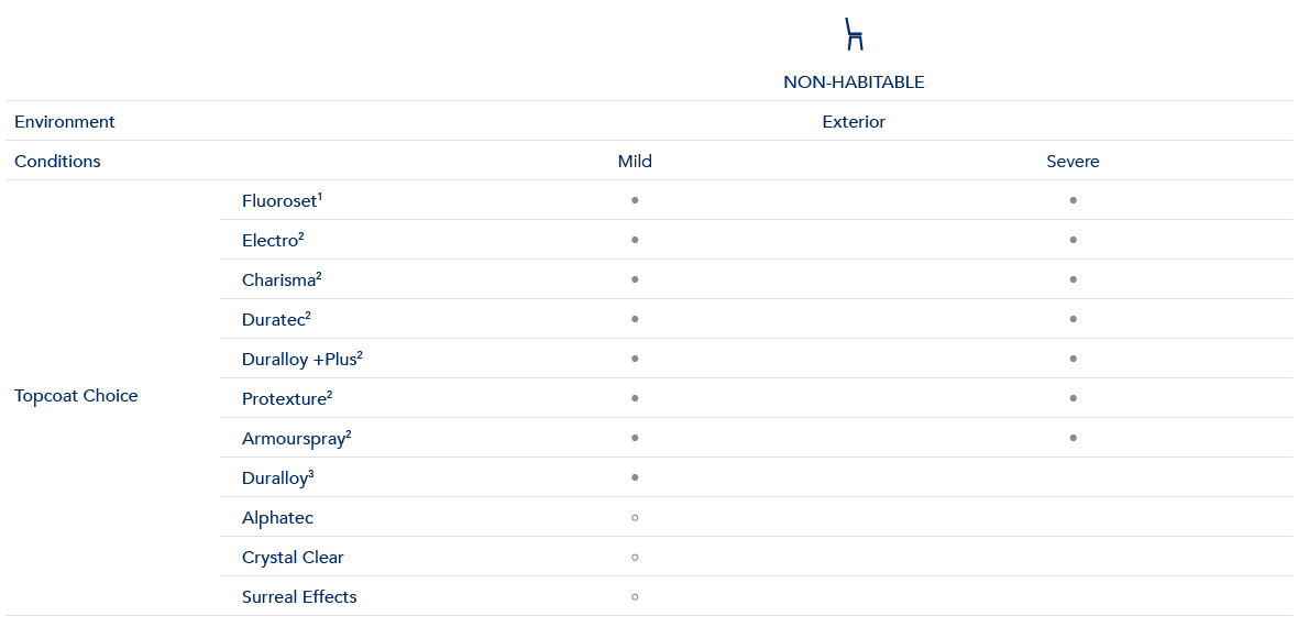 1. Geothermal environments greater than 500m of a bore, mud pool, steam vent, or other source with a pH between 5 and 9. For pH outside this consult Dulux.