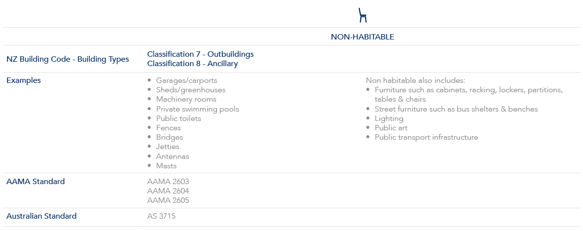 Non-habitable projects are buildings, structures or items that are not dwelling types. Examples can be bus shelters, furniture, lighting, garages, fences and bridges.