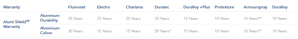 All Dulux premium powder coat products are backed by product specific Alumi ShieldTM warranties. Below is an overview of the warranty periods by product available from Dulux: