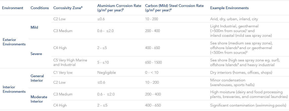 Use the following table which references AS 2312.1, SNZ TS 3404 and ISO 9223 to identify the environment, conditions and atmospheric corrosivity categories. To pinpoint your project's corrosivity zone this table should be used together with the Dulux Macroclimate Corrosivity Zone Maps of New Zealand Guide, available here, or Dulux SpecMap tool available here.