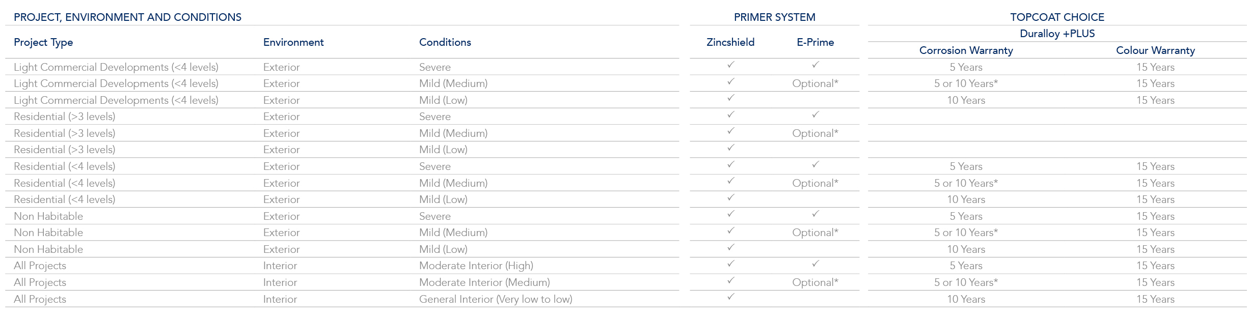 * In Mild (Medium) exterior environments and Moderate (Medium) interior environments, a 10 year corrosion warranty is available with a Zincshield, Grey Primer/E-Prime and the indicated top coat system. Without Grey Primer/E-Prime a 5 Year corrosion warranty is available.
