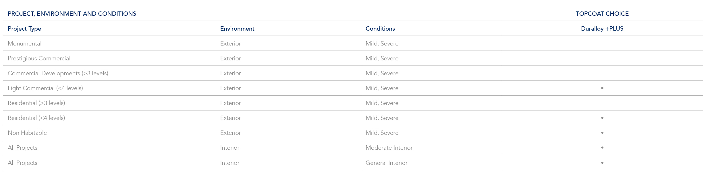 Use the tables below to determine the appropriate the product choice you have to gain a Alumi Shield™ warranty by determining the environment that your project will be exposed to. Use this together with the Dulux Macroclimate Corrosivity Corrosivity Zone Maps of New Zealand Guide, available here, the online Dulux SpecMap tool, available here.