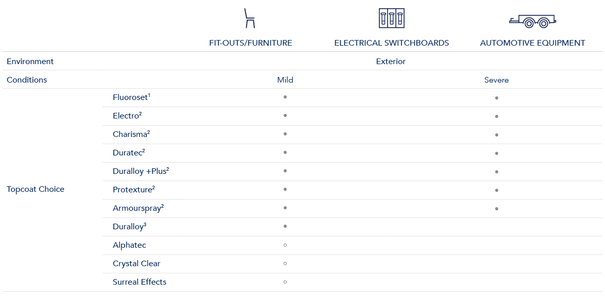 For any interior application of powder coating on non-habitable projects close to liquids, eg furniture, racking etc please refer to the guidance below for your product options for your project.