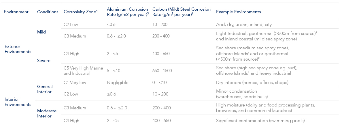 Use the following table which references AS2312.1, SNZTS 3404 and ISO 9223 to identify the environment, conditions and atmospheric corrosivity categories.