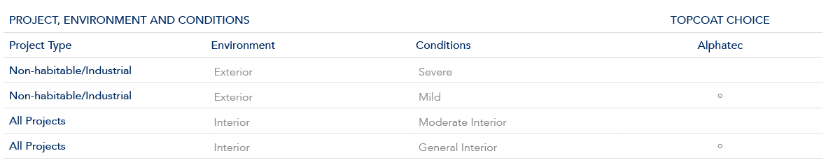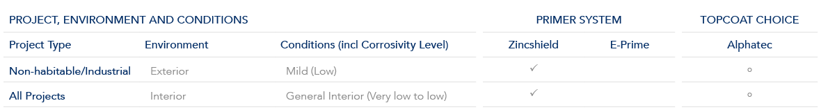 Use the following table to help identify where Alphatec® can be applied on steel projects. Refer to the conditions information to determine the environment that your project will be exposed to.