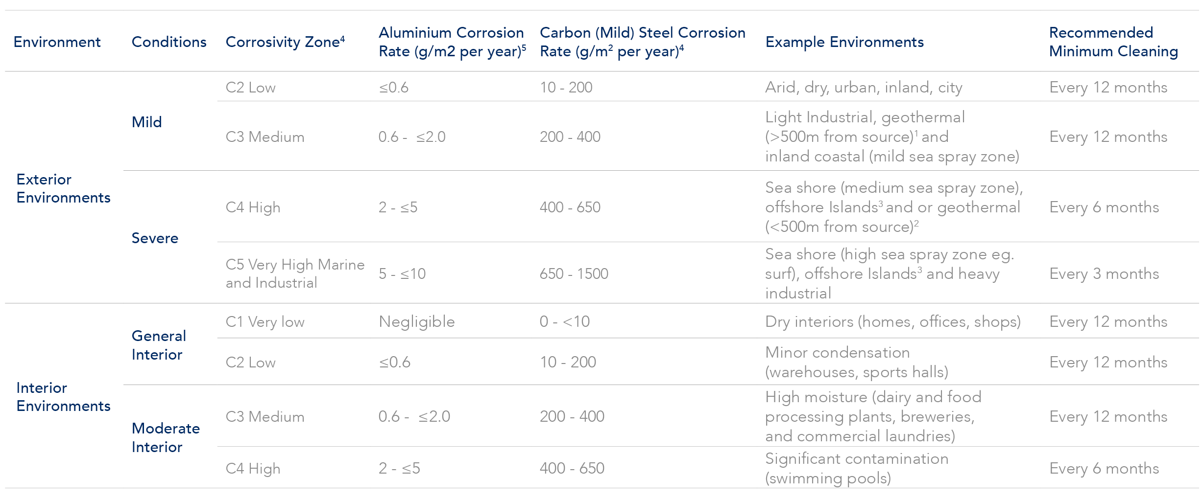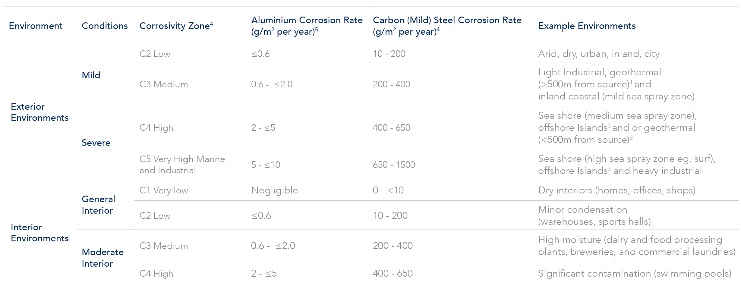 4. The corrosion rates for the first year of exposure for the different corrosivity categories of Aluminium and Carbon (Mild) Steel are determined by the following standards: