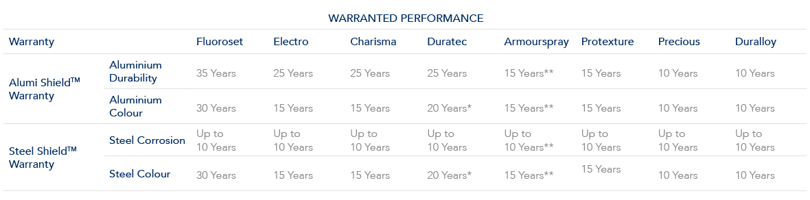 **The Alumi Shield and Steel Shield Colour Warranties are not applicable to Armourspray clear products. The Alumi Shield and Steel Shield Durability Warranties only apply to Armourspray clear products when applied over Dulux Protexture, Duralloy +Plus, Duratec, Electro & Charisma powder coatings.